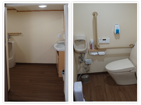 車いす、ベビーカーごとお入りいただける広くて安全なバリアフリー設計のお手洗いです。