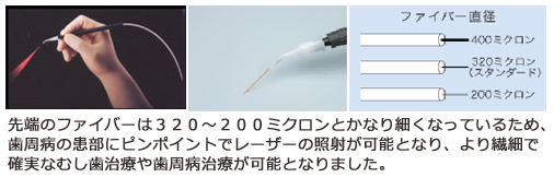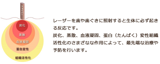 レーザーを歯ぐきの患部に照射して、炎症の原因となっている歯周病菌(トレポネーマ菌等)を直接的に蒸散、死滅させ、炎症を抑え、更に歯周病菌が再繁殖するのを防ぎます。